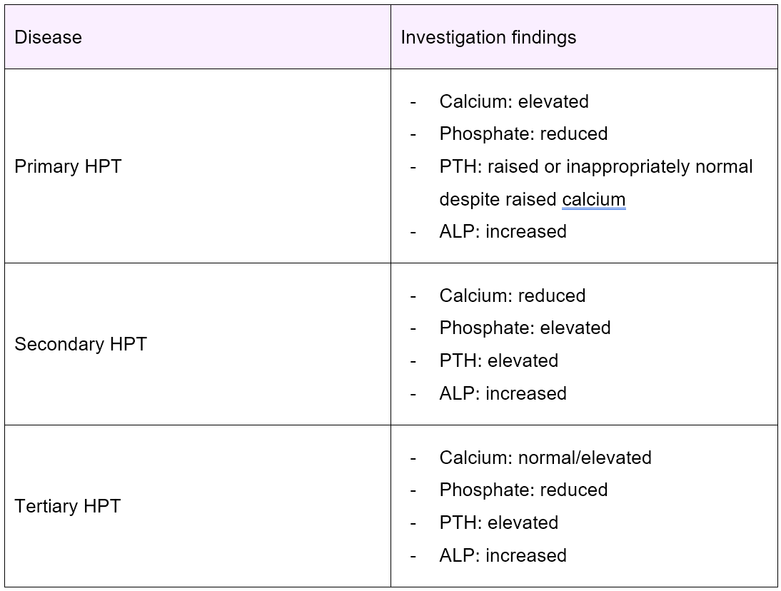 Hyperparathyroidism (HPT) is characterised by an increased level of parathyroid hormone (PTH) in the blood. Increased levels of PTH cause serum calcium levels to increase and phosphate levels to fall. It can be divided according to its aetiology: